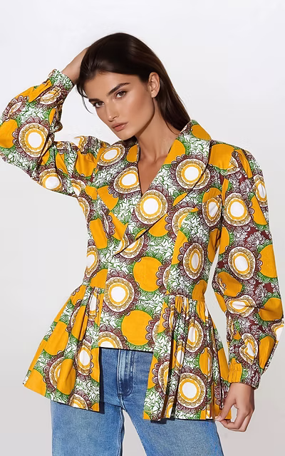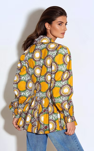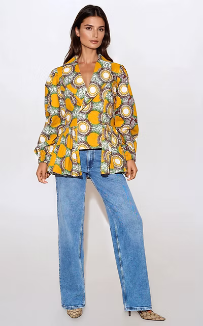Our Chloe Peplum Blazer is the perfect addition to your wardrobe this season. This blazer features a stunning yellow circle print, adding a pop of colour to any outfit. The shawl collar and fitted bodice create a flattering fit, while the elasticated cuffs add a touch of sophistication. This versatile blazer can be worn with jeans for a smart casual look, over a dress or with a fitted skirt for a chic look.