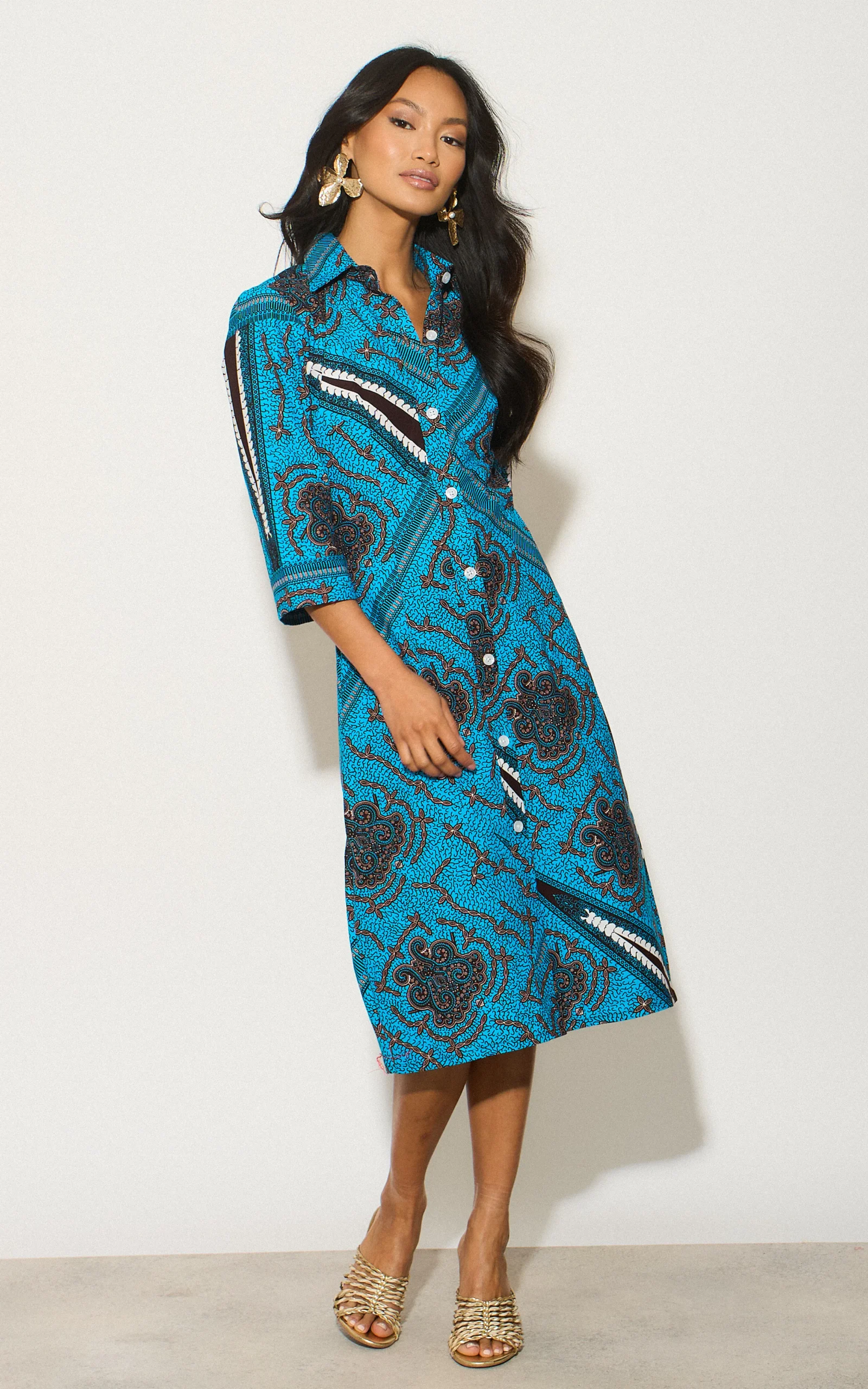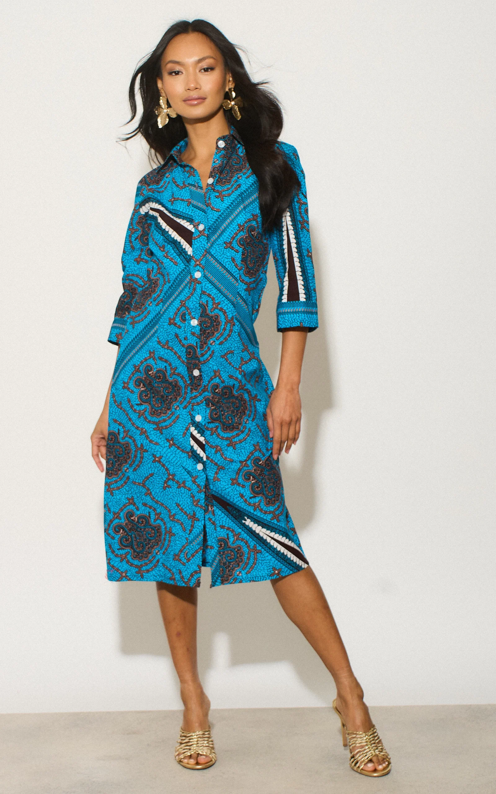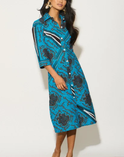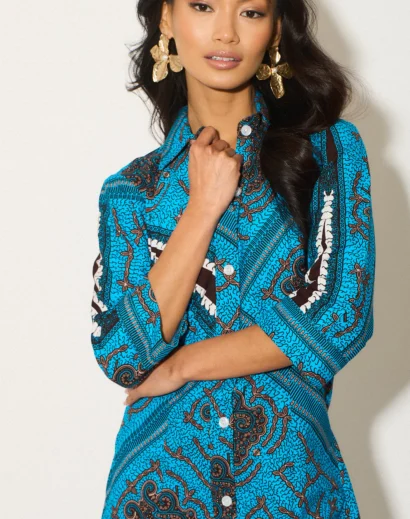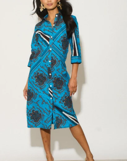 This shirt dress features a classic silhouette with a modern twist. It’s a conversation starter and a celebration of vibrant design. Pair it with your favourite sandals for a relaxed daytime look or wear it with heels and statement jewellery for a night out.